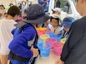 タマン(ハマフエフキ)の稚魚を放流するほか、海の生物の解説などを行います。